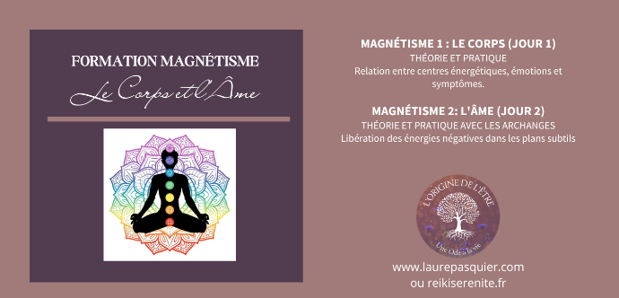 J’ai été formée par Laure Pasquier à la pratique du Magnétisme Corps & Âme afin d’accompagner en séances énergétiques et de transmettre à mon tour cet enseignement.