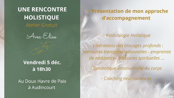 L'inscription est obligatoire via le formulaire de mon site internet : préciser 'atelier une rencontre holistique': https://elise-coach-holistique.com/contact/